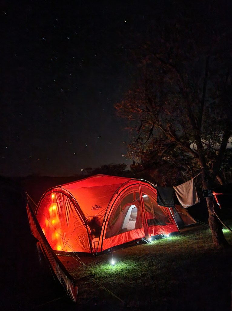 As we’ve shifted most of our camping to holiday parks, our camping set up has evolved as well. In the States we had our (for us, large 6-person dome tent), and a tarp to put over a picnic table. We still use the same tent (which is defintely on the smaller side for NZ holiday park family camping), but we now have a large shelter with table and chairs for hanging out in out of the weather, fancy lighting (which didn’t exist a few years ago), and comfy mattresses.